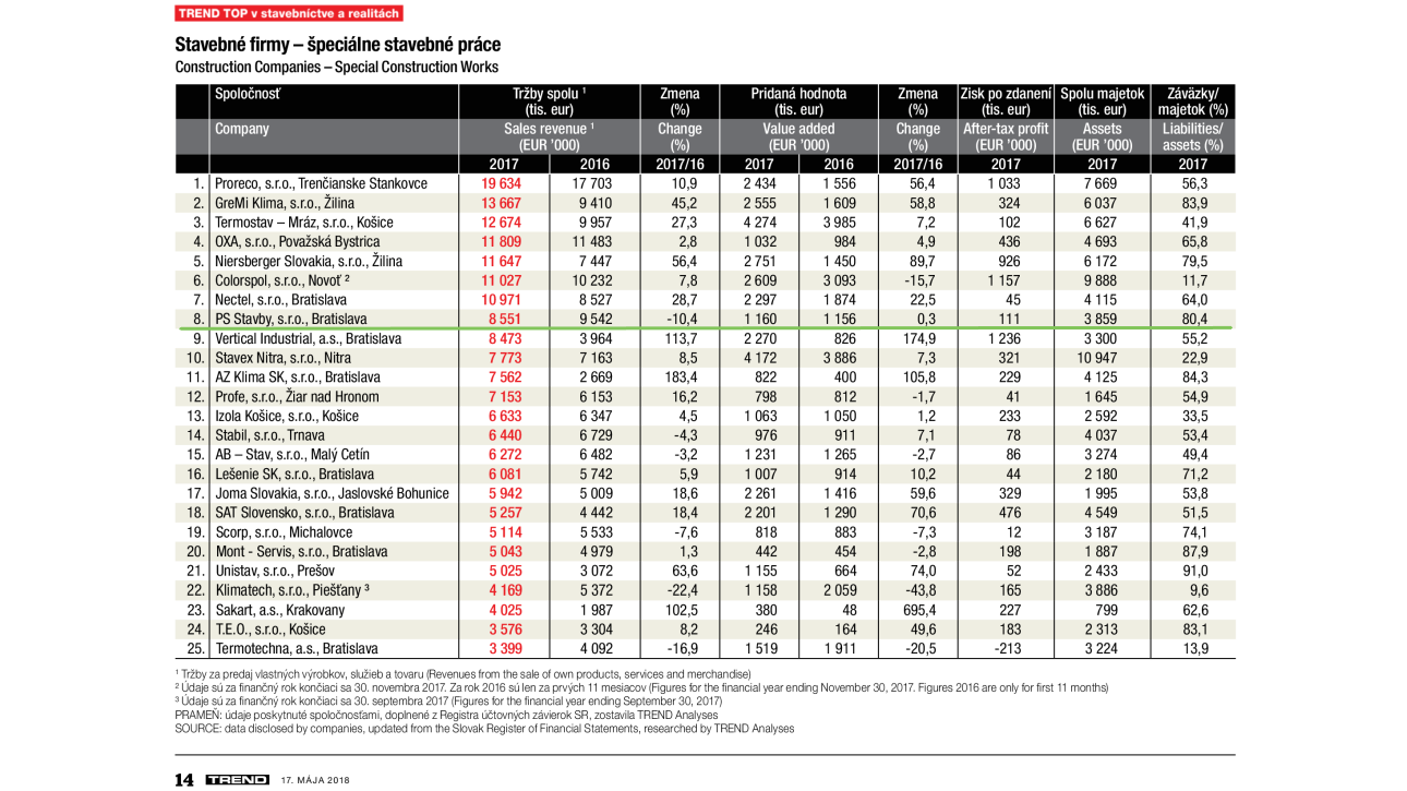 Vydavateľstvo TREND TOP v stavebníctve a realitách zverejnilo v májovom čísle 20/2018 štruktúrovaný rebríček najúspešnejších firiem na slovenskom stavebnom trhu. Ani tento rok nechýbame v prvej desiatke najúspešnejších stavebných firiem v kategórii - špeciálne stavebné práce, kde sme sa tentokrát s celkovým obratom 8,551 milióna eur za rok 2017 umiestnili na 8. mieste.